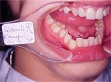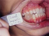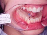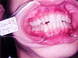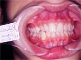 Observamos a posição ectópica do elemento 13, e planejamos um aparelho expansor na maxila, com ênfase ao elemento palatinizado em conseqüência da mordida cruzada. |