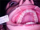 Vista frontal da oclusão deste paciente, onde observamos o desvio dentário acompanhando o desvio facial. O mordida invertida dos elementos 13/43, geraram um fenômeno de adaptação excepcional. A ausência de bossa canina do elemento 13, por falta de função e o aparecimento de bossa canina no elemento 43 por excesso de estímulo. |