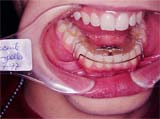O aparelho distalizador do setor direito, sem as cápsulas na região anterior, com intuito de estimular crescimento ósseo também nesta área, onde havia apinhamento. Observem que o elemento 43 está liberado do acrílico, para quando o espaço for recuperado, posicionar – se naturalmente, pela pressão labial. |