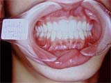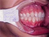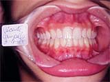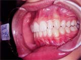 Em menos de 5 meses, vemos a movimentação já terminada, com sensível melhora das condições oclusais, que agora podem se auto-estimular. Duas coisas nos chamam atenção neste caso, primeiro, é que não houve necessidade de aparatologia na arcada superior, segundo e mais importante, foi o aparecimento da bossa canina do elemento 13, respondendo ao estímulo do hiperbolóide. |